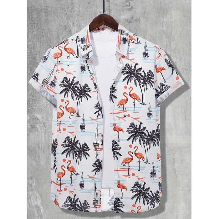 Men's Shirt Top, Flamingo & Coconut Tree Print, Camp Collar Bowling Shirts Short Sleeve Closure Summer Hawaiian Shirt Male Casual Button Up Shirt